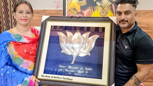 Jammu and Kashmir-based jeweler Rinku Chauhan made a lotus flower, the BJP's symbol, using three kilograms of pure silver to give it to Prime Minister Narendra Modi for the third time.