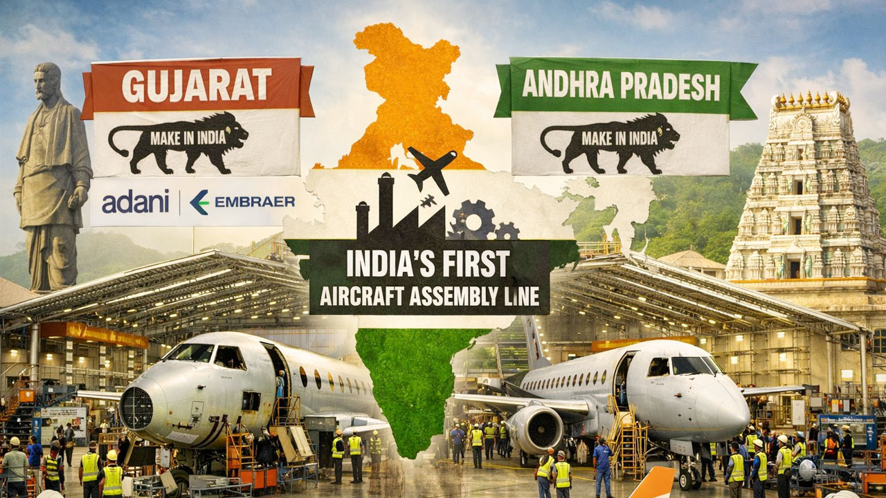 As part of efforts to strengthen the state’s aerospace sector, Adani Aerospace has entered into an agreement with Brazilian aircraft manufacturer Embraer. Under this partnership, the companies plan to set up an aircraft manufacturing unit in India. Embraer is globally known for producing business jets, commercial aircraft, and military aviation equipment, with the proposed facility expected to focus primarily on small and medium-sized passenger aircraft.